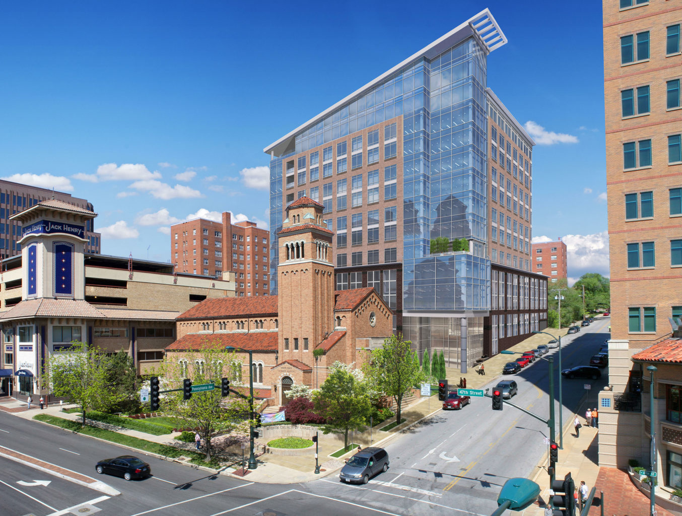 46Penn Centre, the newest high-rise development on the Country Club Plaza, is set to open in July 2020. The 14-story, 220,000 +/- SF mixed-use building is currently under construction. It is set to be constructed with only 4 columns on 1.17 acres of land, making for maximum space plan efficiency. The building will offer state-of-the-art, world class amenities including 11,000 +/- SF of restaurant spaces below the 209,000 +/- SF of office space. One restaurant (3,100 SF) will be located on the lobby level, while the second (7,000+ SF) will be located on the ground floor level. The ground floor will be above the lobby floor, but also accessible from the street. Each of the spaces overlook the Country Club Plaza with access to the covered parking garages. AREA’s Andy Epstein is leading the charge in the leasing of the restaurant spaces.