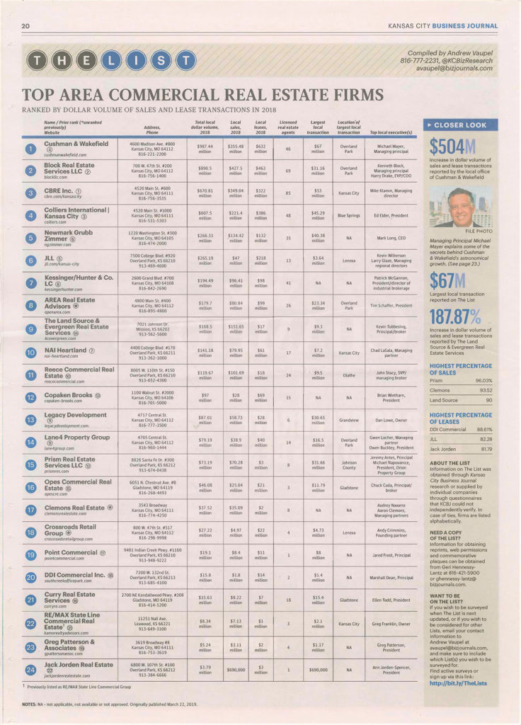 AREA has also made it in the top 10 of The Kansas City Business Journal’s list of “Most Active Commercial Real Estate Firms” for 2018. AREA was ranked #9 based on number of local transactions last year, with 249. To view the list online, click here (must have KCBJ subscription). To download the list, click here.