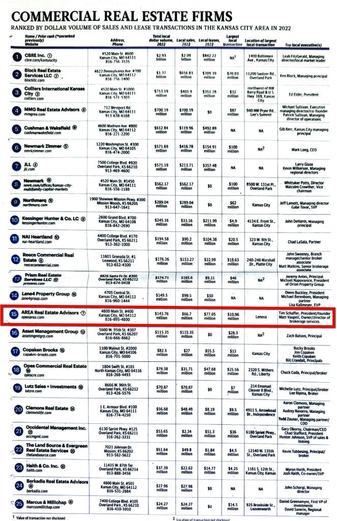 AREA has made the Kansas City Business Journal’s list of Largest Commercial Real Estate Firms in the metro area. The list is made up of area companies ranked by dollar volume of sales and leases in 2022. AREA is ranked number 15 amongst the 35 companies included.